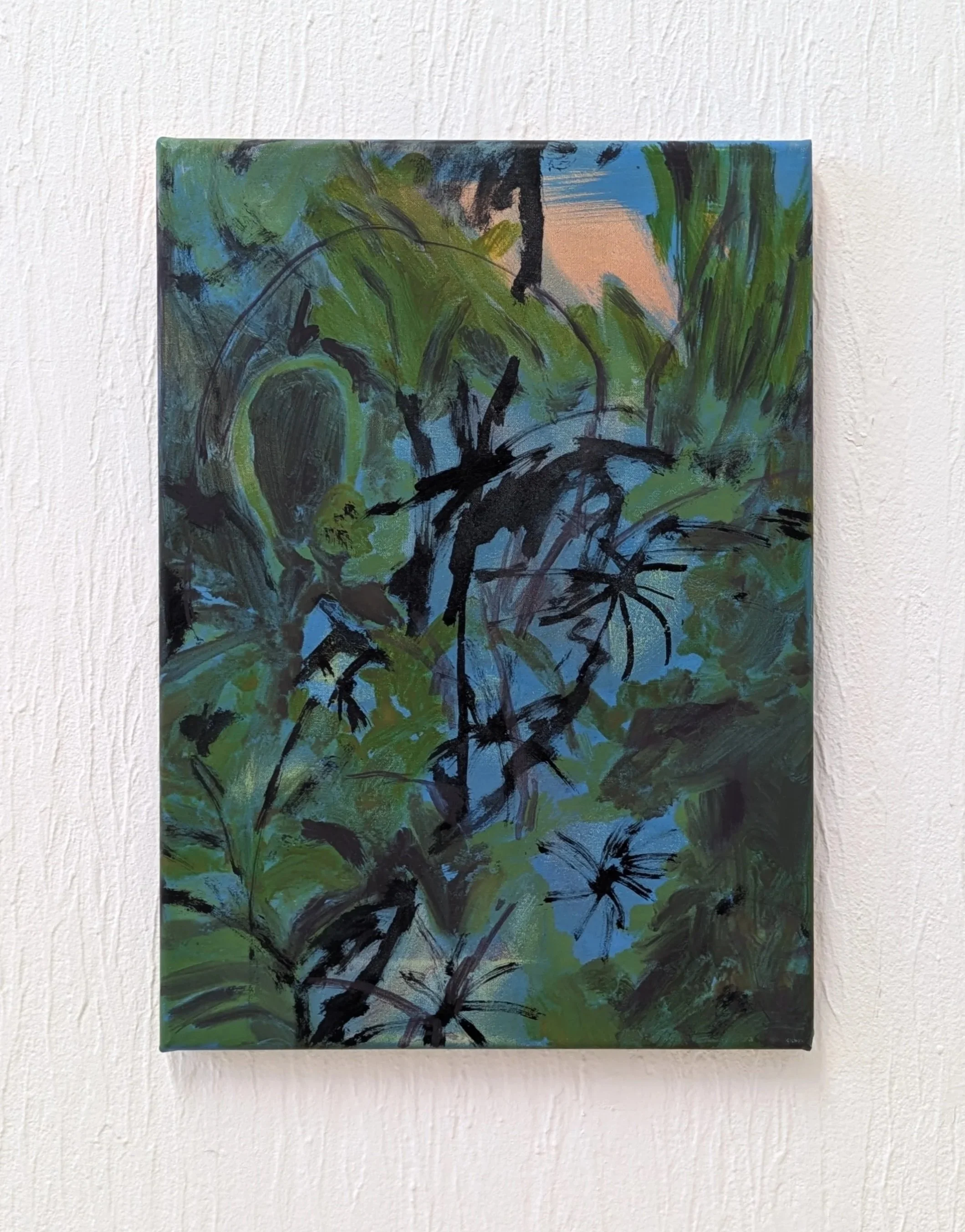 Lauren Doughty, To collect a leaf is to partake in the world as it turns, while I exist in it, 2025. Oil paint and acrylic on primed linen. 25 x 36.5cm